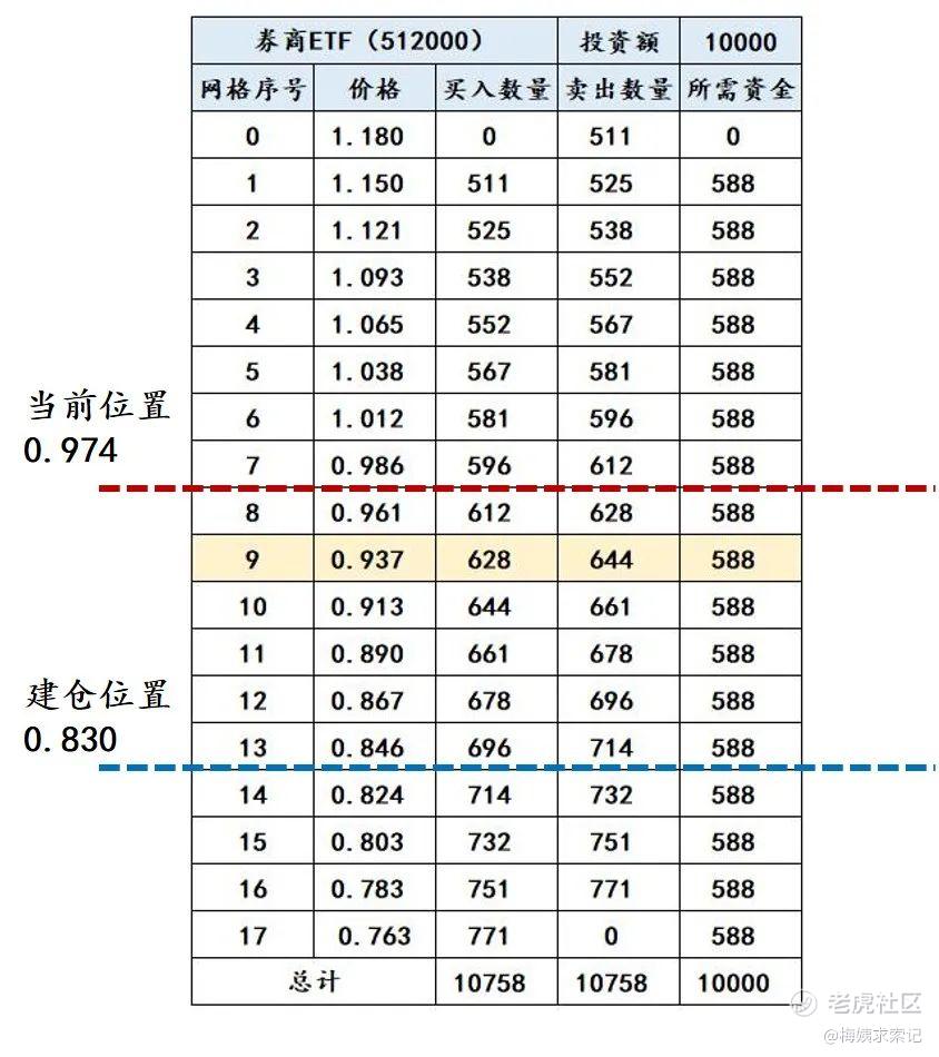 首先,我们先来看看券商ETF,目前处于我们当初设置的完整网格的什么位置。我们来看当初的网格表:
