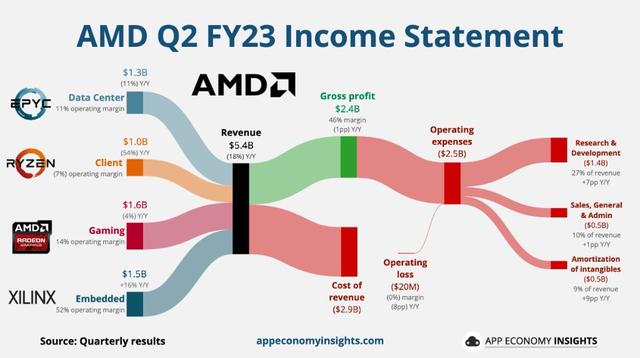 包括数据中心和服务器处理器、半定制系统级芯片(SoC)和视频游戏机芯片在内,AMD的企业、嵌入式和半定制事业部二季度营收15亿美元,同比增长16%,一季度同比增1.6倍。