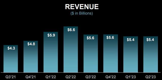 二季度非GAAP口径下调整后营业收入约为53.59亿美元,同比下降18%,同比连降两季,环比大致持平一季度水平,高于公司指引区间的中值53亿美元,也高于分析师预期的53.2亿美元。