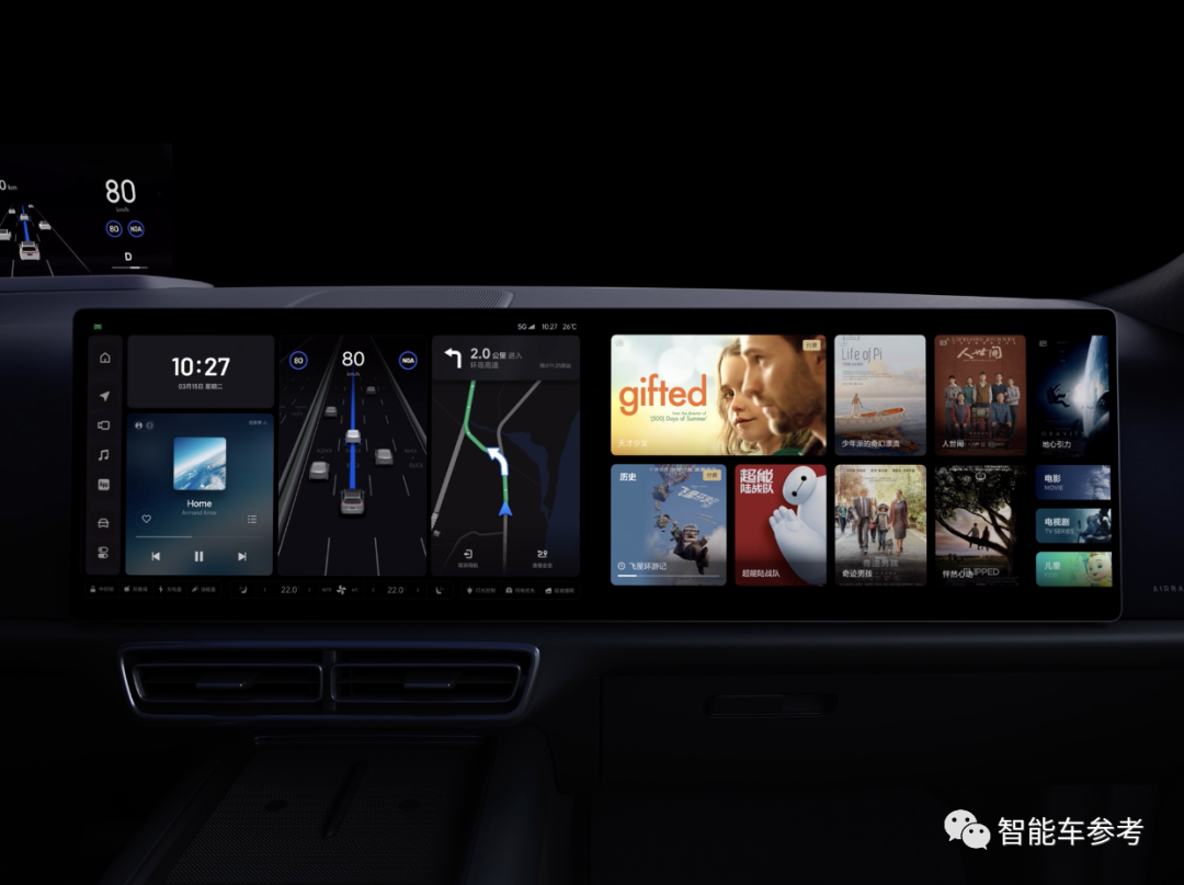 5块屏幕包括13.35英寸的HUD抬头显示,可显示包括智能驾驶、导航、行车信息等多种信息。