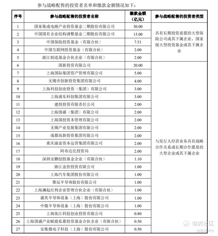 在此次上市前夕,华虹半导体披露了战略配售投资者,从名单看来,参与战投的机构共28家,其中既有国家级大型投资基金,也有半导体产业链厂商。