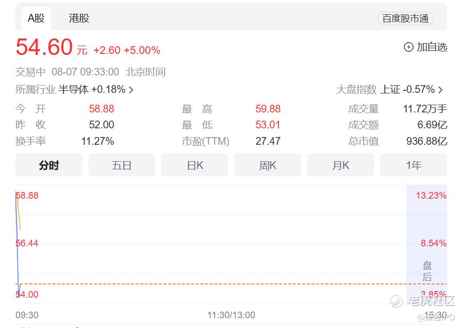 今日,华虹半导体登陆科创板,股价开盘大涨13%。截至发稿前每股为54.60元,涨幅达5%,总市值936.88亿。