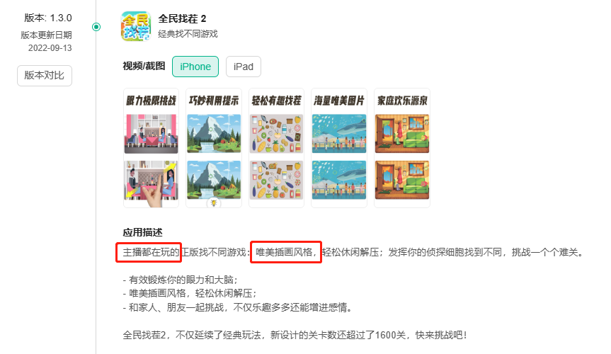 而在9月初的一次版本更新中,找不同的图片整体变为了手绘插画风格,更偏向轻松解压的方向。同时应用描述中也带上了“主播都在玩”的字样,推测是开始在抖音上进行KOL买量了。