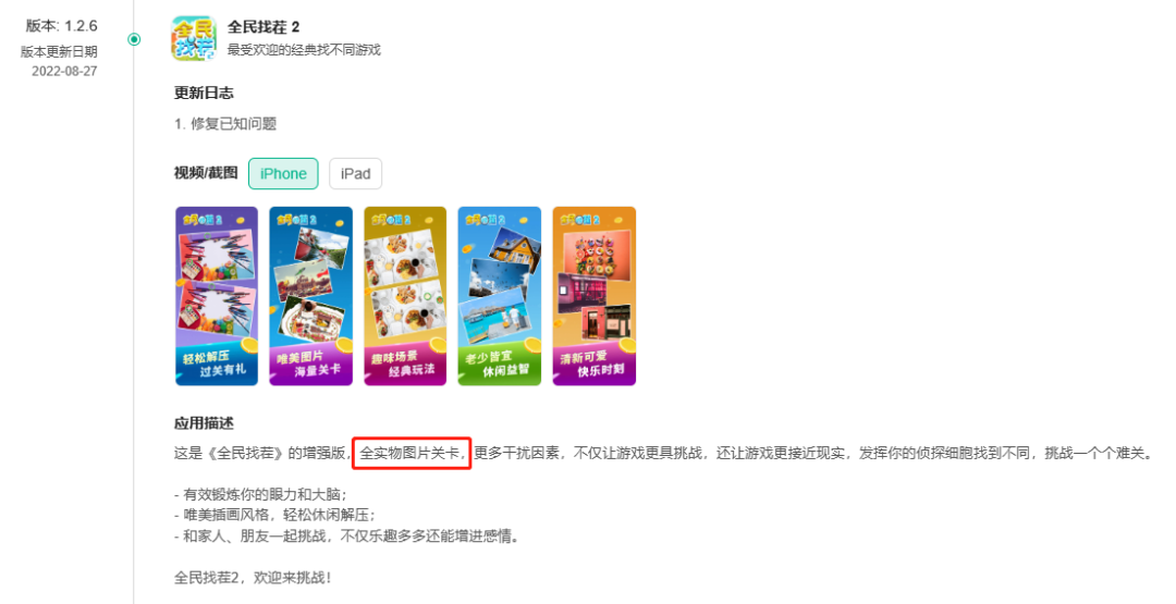 从七麦数据记录的信息来看,游戏从最开始直到8月底时都是从实物照片中找不同的玩法。