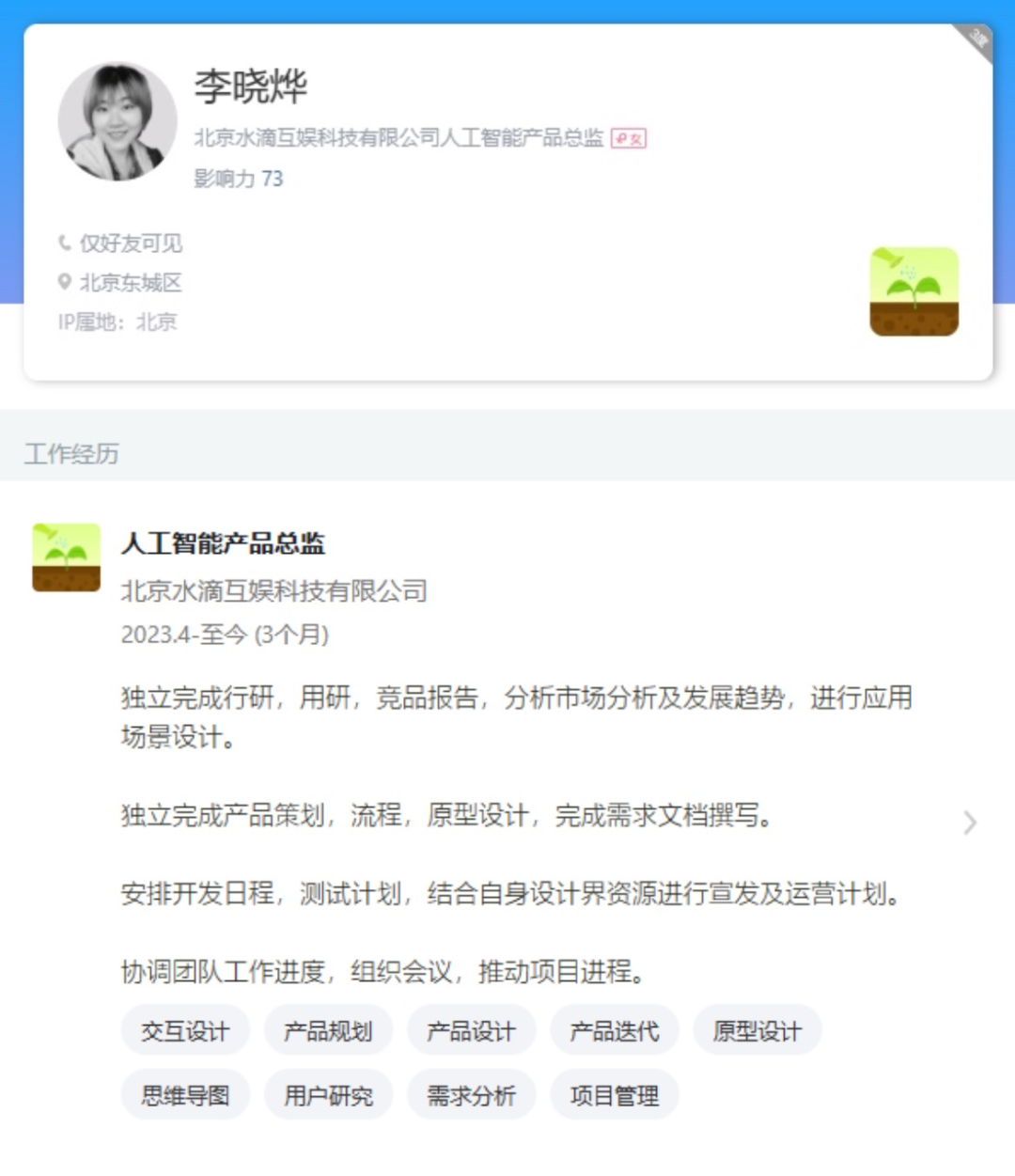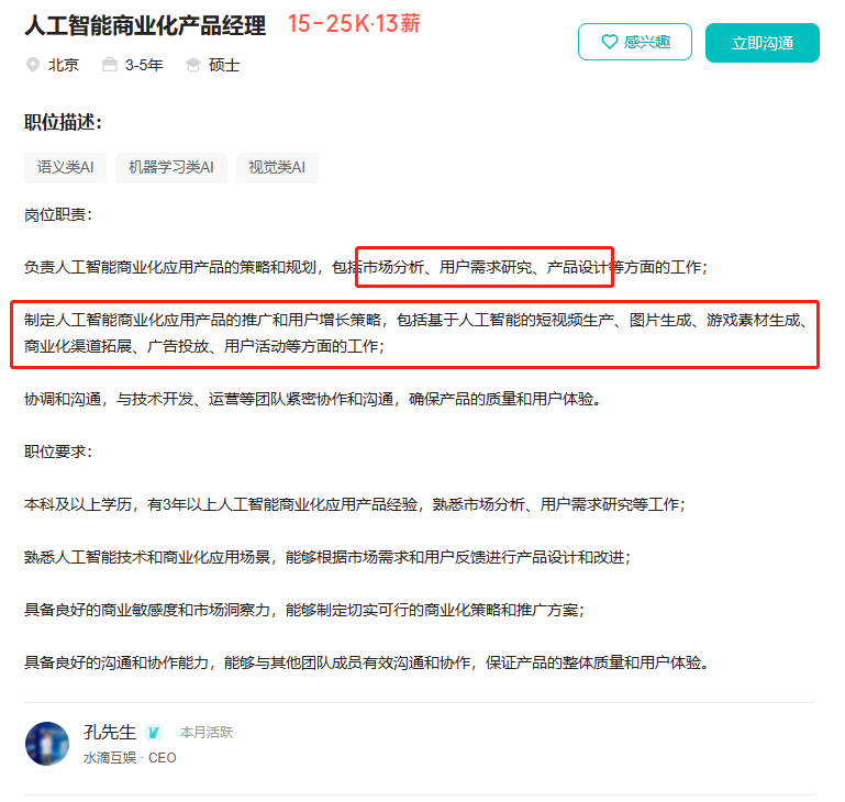 同时根据脉脉信息,也是在今年4月,公司迎来了一位新的“人工智能产品总监”。