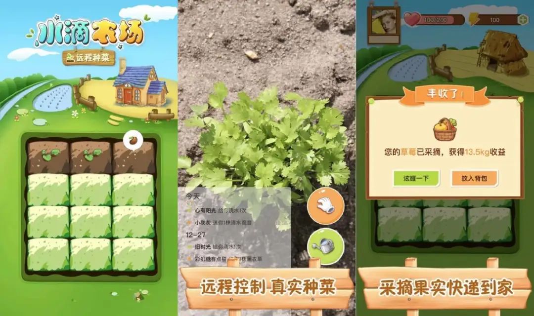这是一款类似现在的《芭芭农场》的游戏,玩家在游戏中种菜、收菜、偷菜,收获的菜可以邮寄到家,也可以在游戏内出售提现。它最大的特点是“物联网”概念与实景的结合:玩家可以通过实时摄像头看到自己种植的植物,每点击一下浇水都能看到现实中的植物确实被浇灌了一次,能够获得很强的参与感。团队还为此专门研发了一套可以实现云控制的种植装置。