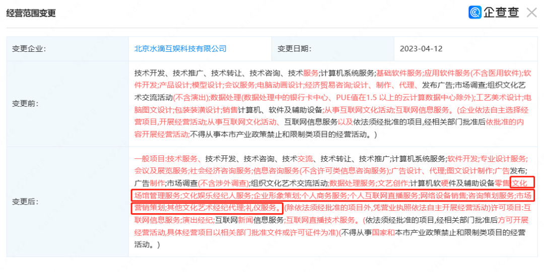 今年上半年里,尽管还没有新产品出现,但企查查页面显示,公司经历了一系列的工商变动。首先是在今年3月,一位从2018年起就担任水滴互娱董事的高层,不再担任该职位。然后在今年4月,公司办公地址发生了变更,同时经营范围也发生变更,新增的业务包含经纪人服务、直播服务在内。
