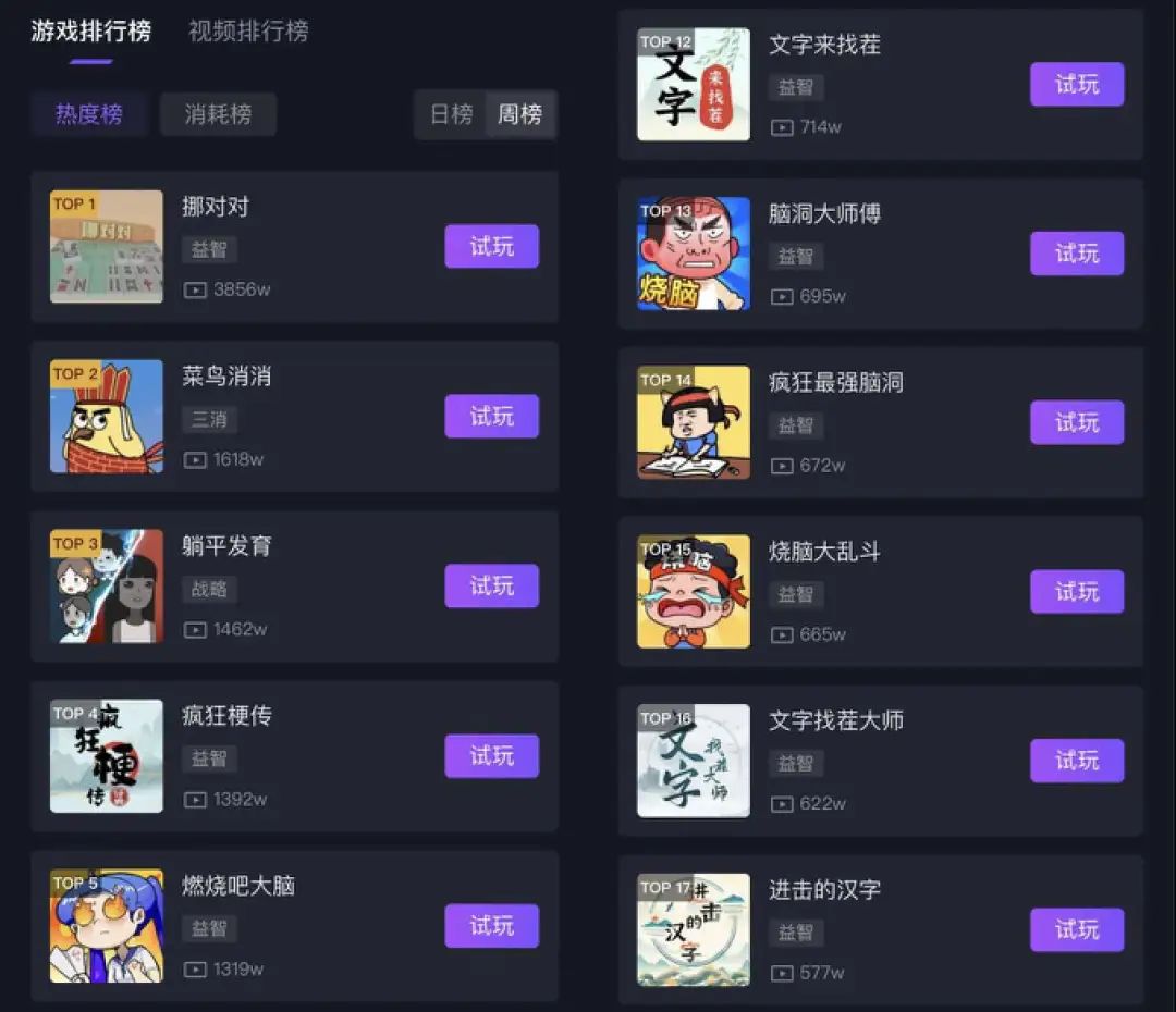 而在抖音小游戏热度榜上,第4、第5名,以及第12至第17名,都是益智解谜类,似乎这一品类最近成为了小游戏的热门赛道。