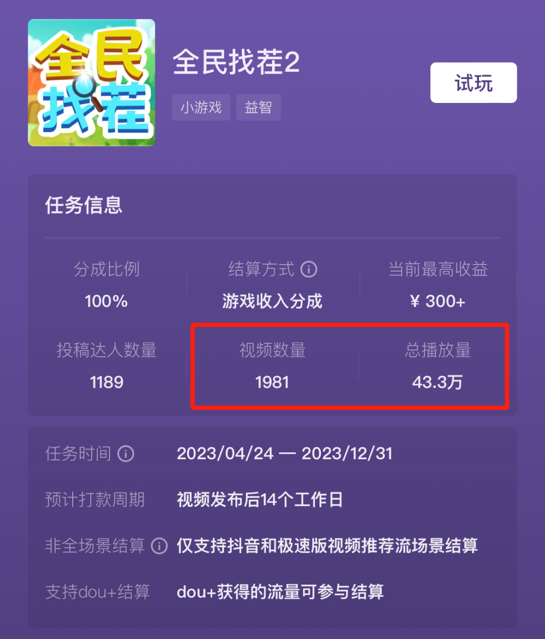 从抖音的相关统计页面可以看到,《全民找茬2》的达人视频数量已经接近2000条,播放量则有43.3万。
