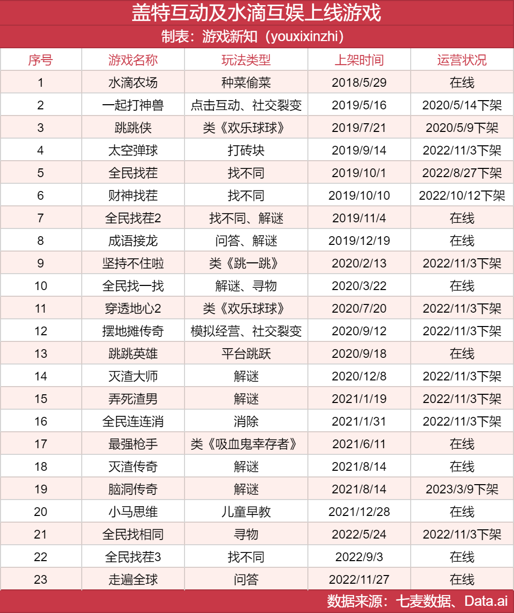 公司大致也是在这段时间开始进一步探索游戏业务。从2019年5月开始到现在,盖特互动和水滴互娱名下陆续上线了许多休闲游戏,其中盖特互动名下有2款,水滴互娱名下有20款。企查查显示,在与孔祥政关联的共4家公司中,有一家是投资公司,有一家名下无任何内容、且已经于2017年注销;剩余的两家就是母公司盖特互动和子公司水滴互娱,这两家公司下至今未再看到其他新的互联网产品。孔祥政此后的业务活动,似乎完全围绕着游戏展开。