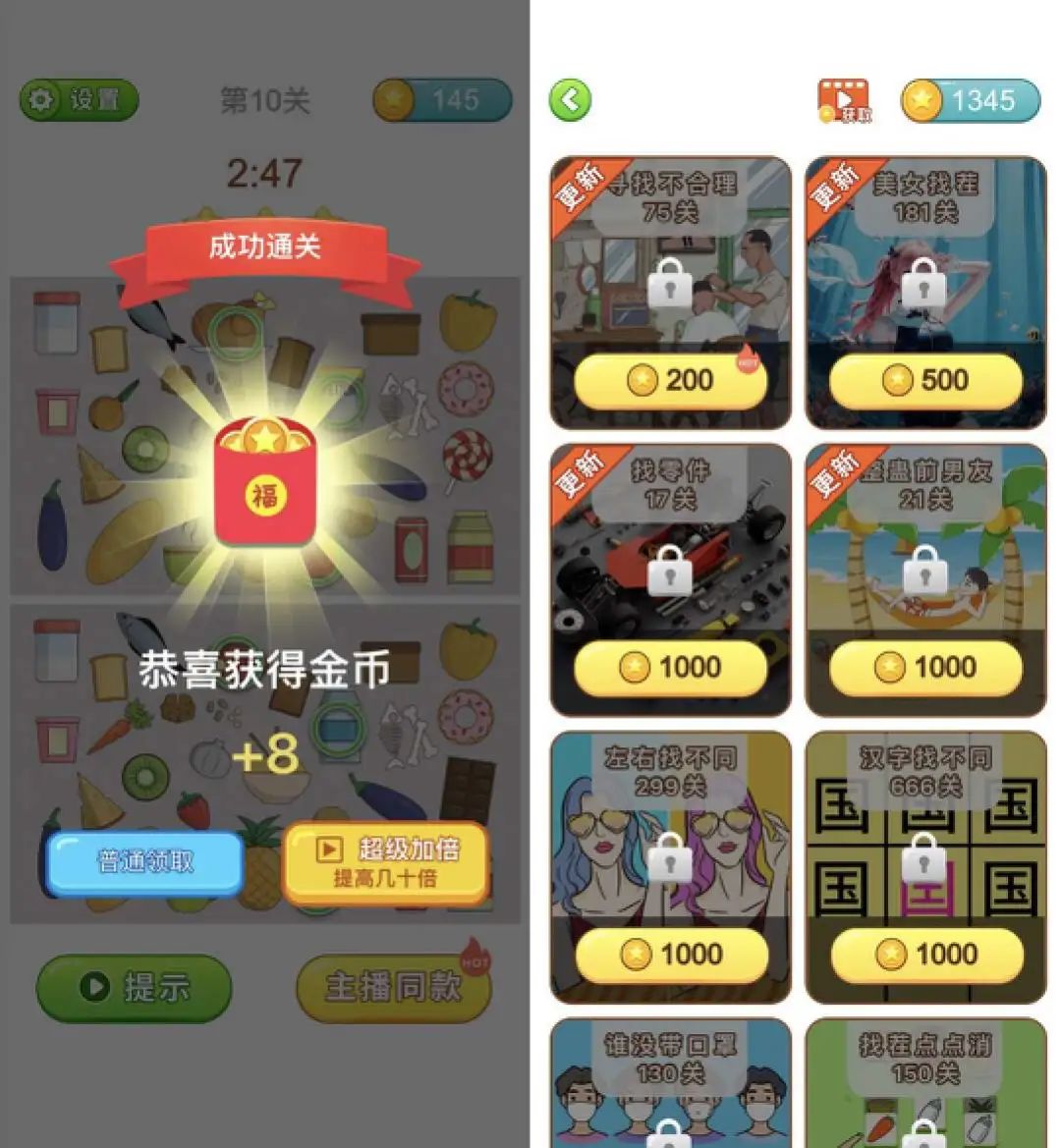 从游戏内容来看,现在的《全民找茬2》更像是一个游戏合辑。进入游戏之后直接就是传统的找不同玩法的界面。玩传统的找不同游戏可以获得金币,金币可以用于开启其他玩法。这些其他玩法包含了公司其他游戏里涉及过的解谜、寻物、消除等等,基本是把以前游戏的内容直接拿过来用了。这些“新玩法”有许多都常常在达人视频中出现。想要尽快玩到更多的玩法,就需要在通关获得金币时观看广告,才能获得更多金币。