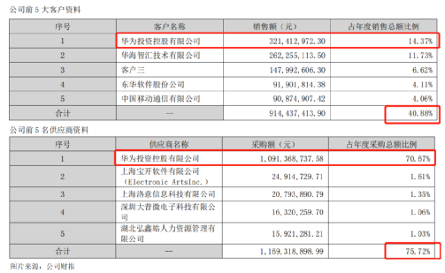 2022年公司向华为销售、采购金额分别为3.21亿和10.91亿,较2021年分别增长17.2%、38.6%。其中,对华为采购金额占采购总金额的70.67%。