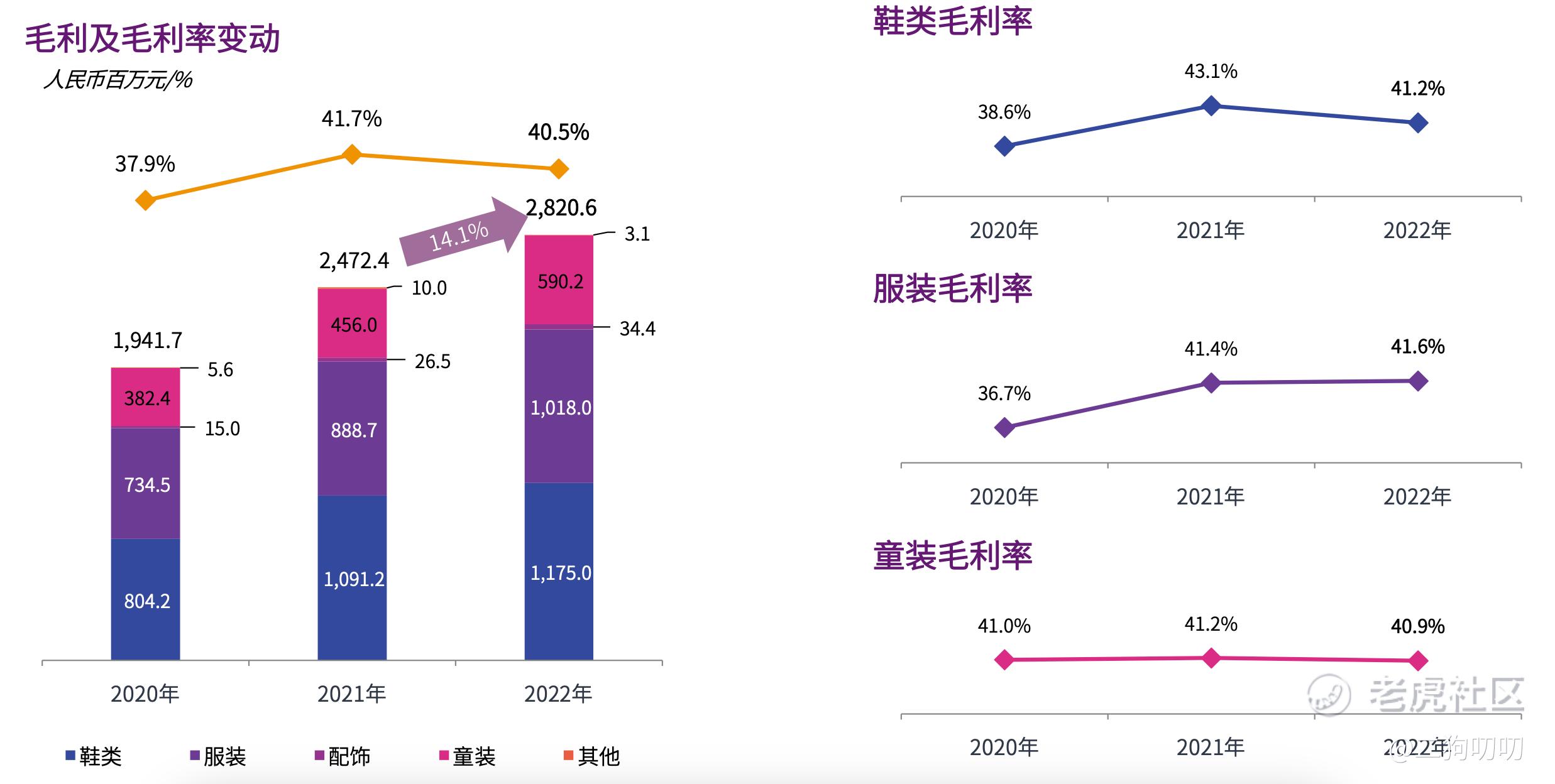 根据最近三年年报数据显示,2020年、2021年以及2022年公司毛利润分别为19.42亿元、24.72亿元、28.21亿元,复合年增长率达到了20%,增速还是相当惊人的,同期毛利率率分别为37.9%、41.7%以及40.5%。值得一提的是,公司童装近三年毛利率一直维持在40%以上,表现很稳。