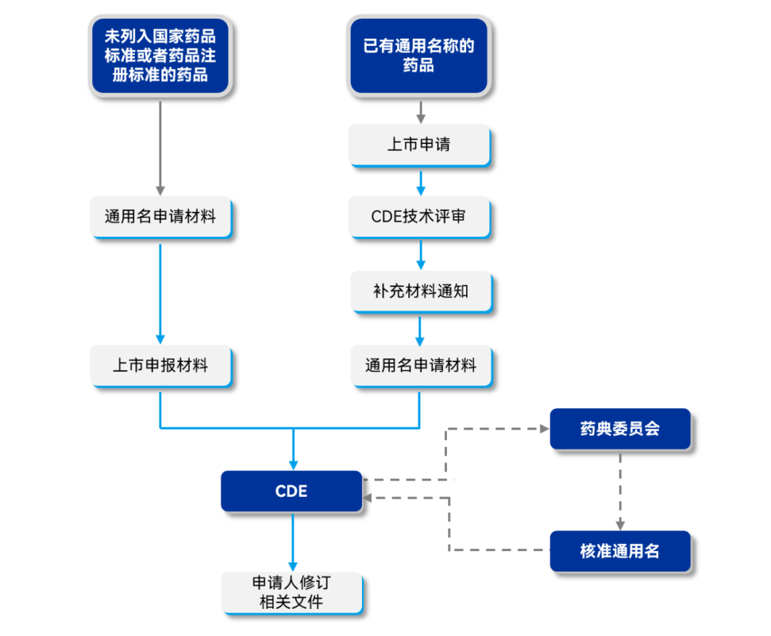 因此,对于在中国申请上市的药品,一般采用INN作为药品的英文名,对应的中文通用名则可按照命名原则拟定(中国药典委公示的名称或企业自行拟定),且需在提交药品上市申请时经药典委核可(创新药、生物类似药及境外中药)并最终由NMPA确认。