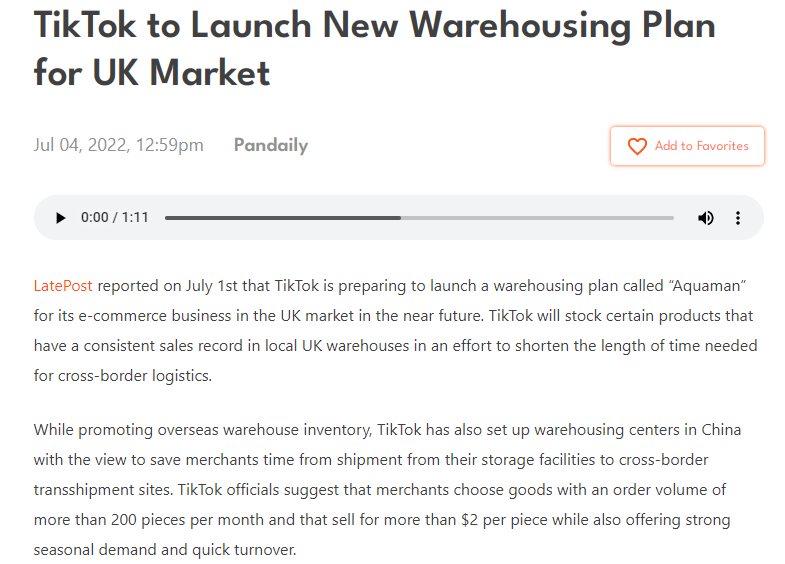 TikTok在英国推出FBT物流服务,全面对标亚马逊
