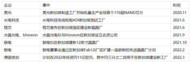 最近一年内,也不乏有一些半导体大厂宣布落户新加坡或者增加产能,如Soitec计划在新加坡投资4亿欧元(约4.4亿美元),将硅晶圆厂产能提高一倍,台联电预计投资324.17亿新台币(约10.22亿美元)用于晶圆代工,其中部分将用于投资新加坡工厂等等。