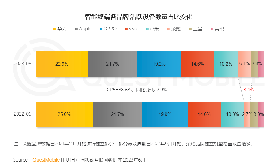 QuestMobile《2023智能终端半年报告》显示,截至2023年6月,华为在智能终端品牌中占比最高,为22.9%,如果荣耀没有从华为独立出去,二者合并甚至能超过OPPO、vivo之和。