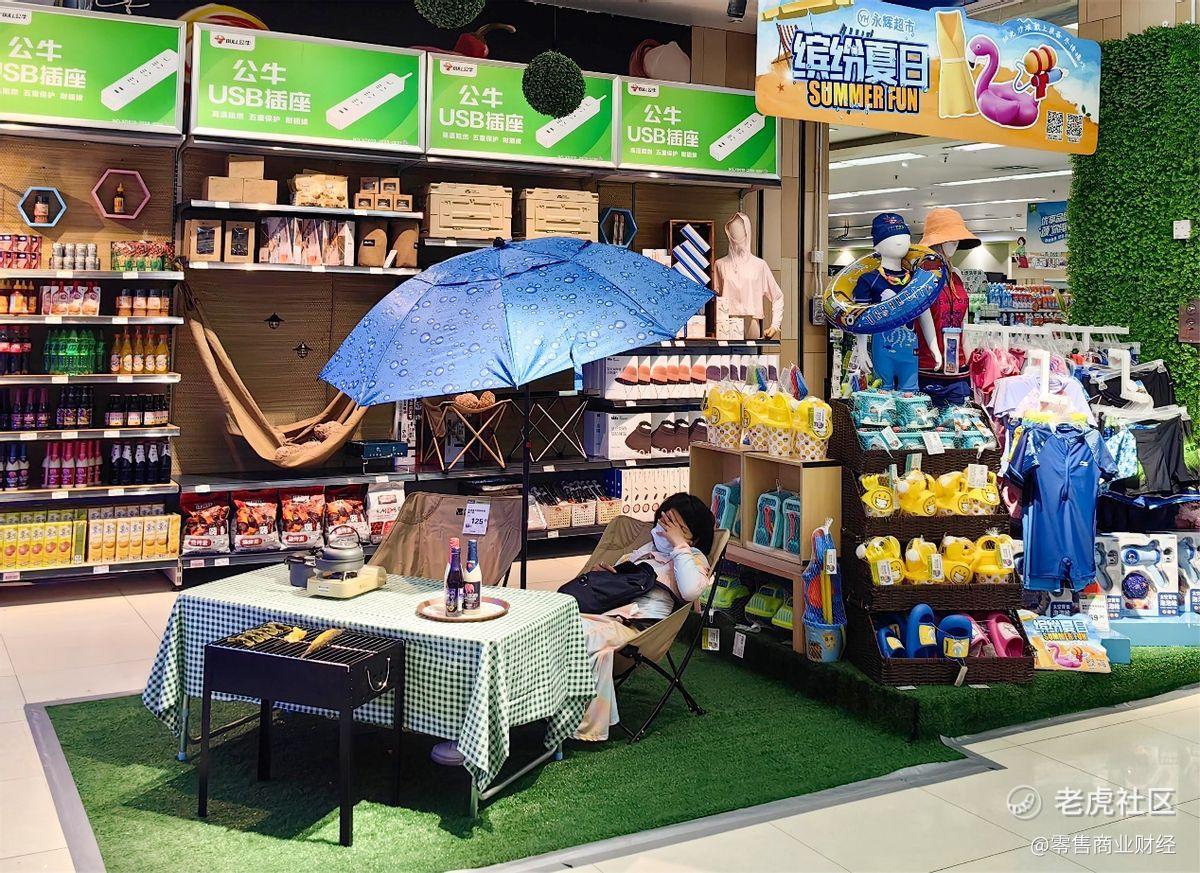 除此之外,永辉也在多家门店内增加了场景式的主题布置,即根据季节、节庆、消费场景的不同,在店内公共区域设置主题并集中展示关联产品。如悬挂了多个游泳圈的欢乐水上用品陈列区、布置了野餐垫和躺椅的户外用品陈列区、集合了牙膏、牙刷、漱口水、牙线棒等关联产品的口腔健康陈列区等,满足消费者在某一场景下的一站式购物需求。