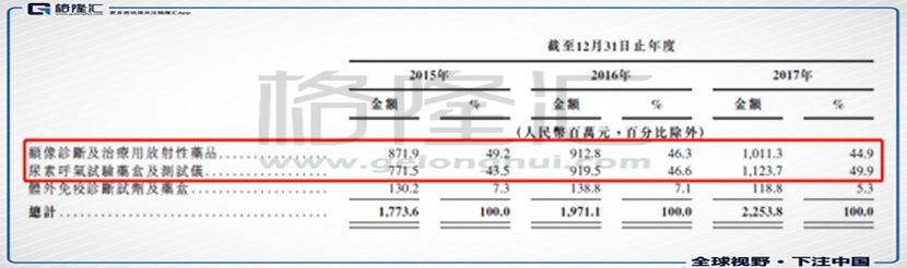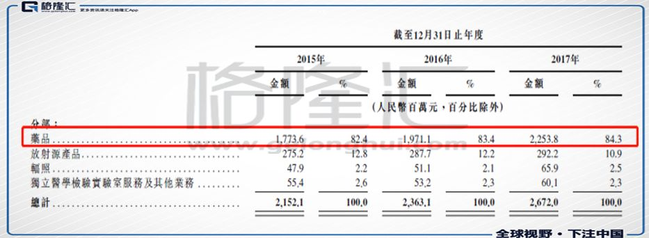 药品为公司的主营业务,2017财年药品板块为公司贡献了22.54亿元,占总营收的84.3%。细分下来,共有三类产品,包括影像诊断及治疗用放射性药品、尿素呼气试验药盒及测序仪、体外免疫诊断试剂及药盒,分别占40.4%、78%、及35%。