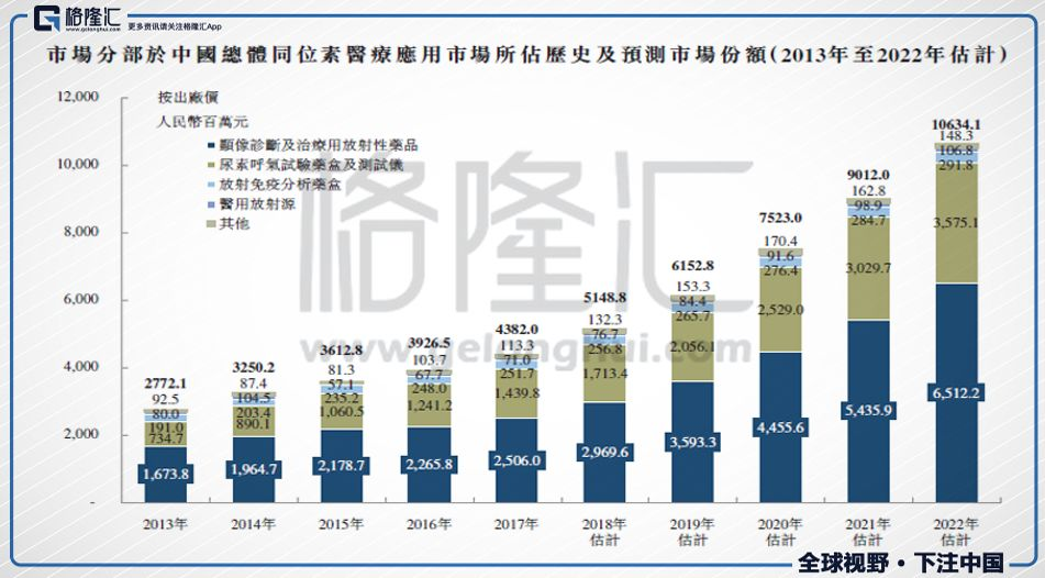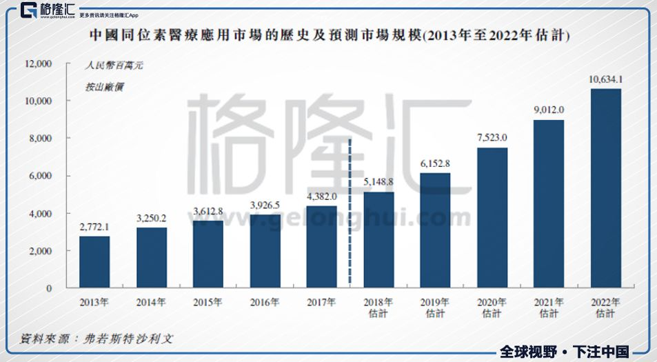 2017年,中国同位素的医疗应用市场规模为43.82亿元人民币,2013~2017年的复合年增长率为12.1%,预期2022年市场规模可以增至106.34亿元,复合年增长率达到19.4%。