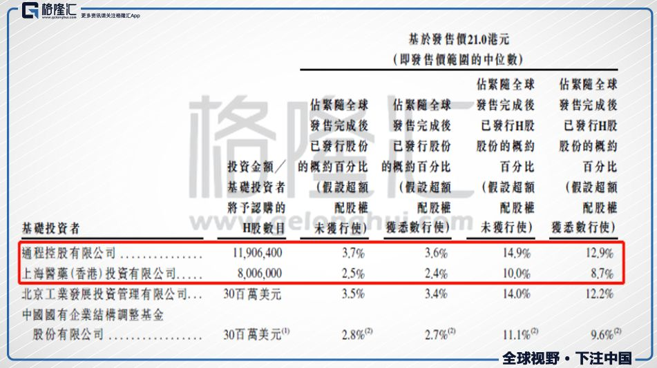 此次共有4名基石投资者,2个上海,2个北京。名单中出现了两家上市公司的身影,通程控股和上海医药香港。上海医药(2607.HK、601607.SH)大家都比较熟悉了,上药通过在香港的境外投资融资平台上海医药香港,认购800.6万股,占H股流通股的10%。通程控股为上海实业控股(363.HK)间接全资拥有的子公司,上实控股将通过通程认购1190.6万股,占H股流通股的14.9%。而这两家上市主体,都是上海实业集团的非全资拥有附属公司,上实集团持有上实(363.HK)59%的股份,间接持有上海医药(2607.HK、601607.SH)33.6%的股份。