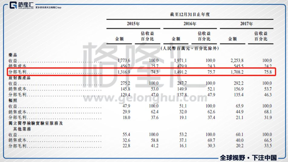 2017财年,公司录得营收26.72亿元,同比增长13.07%,毛利率70.5%,基本与往年持平,净利4.75亿元,同比增长9.5%,权益股东应占利润2.71亿元。其中药品分部贡献22.54亿元,放射源产品贡献2.92亿元,辐照6590万元,实验室服务及其他业务贡献6010万元。