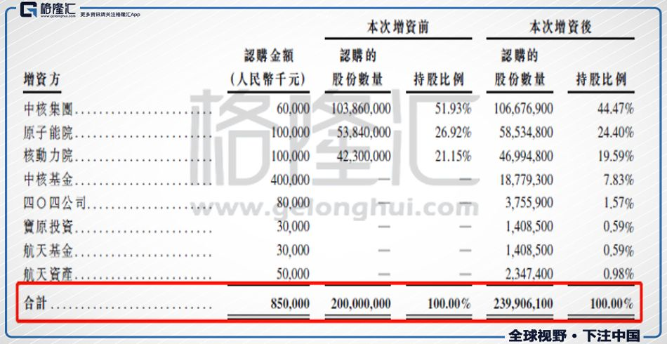 上市前(2016年12月21日),中核集团、原子能院、核动能院、中核基金、四〇四公司、宝原投资、航天基金及航天资产,8家公司进行了定增,合计金额为8.5亿元,认购了3990.6万股,估值约为51亿人民币(约61亿港元)。