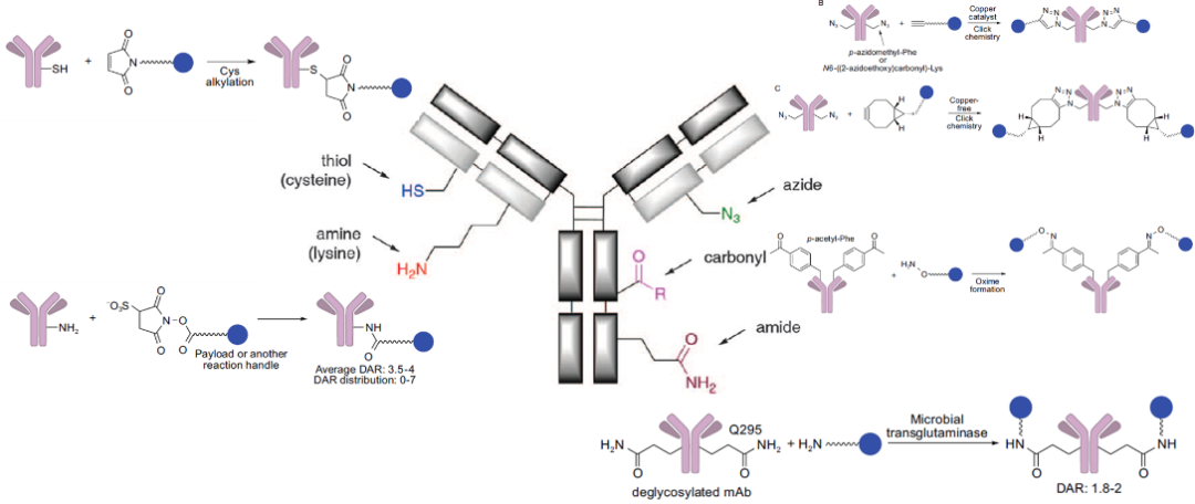 抗体分子中主要参与化学反应的基团是半胱氨酸的巯基和赖氨酸的伯氨基,参与了随机偶联ADC常用的两个反应,即巯基和马来酰亚胺的迈克尔加成反应、氨基的琥珀酰亚胺酯的取代反应。此外,可以在抗体中定点插入非天然氨基酸从而引入可反应的羰基和叠氮基,利用羰基和羟胺成肟反应以及叠氮基和炔基的click反应连上linker-drug,最后是抗体自带的谷氨酰胺,利用谷氨酰胺转移酶也可以实现偶联,这就涉及到酶催化的定点偶联(图9)。