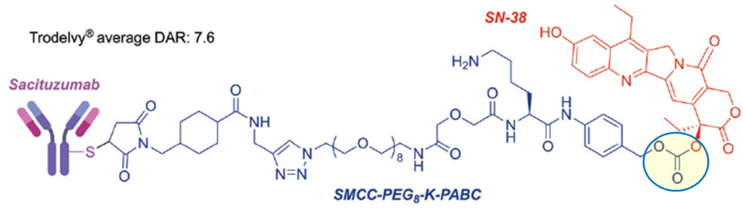 碳酸酯键:该linker和毒素连接位点同时是触发毒素释放的裂解基团,上市ADC药物Trodelvy采用的是此种连接方式(图12)。