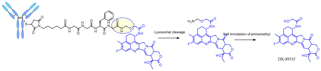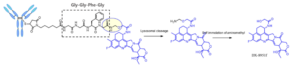 Enhertu的酰胺键连接位点有一个类似前药的设计,四肽连接子GGFG最后一个甘氨酸的羧基和氨基缩合成酰胺键,经酶切后氨基亚甲基自消除,最后释放出DXD(图13)。