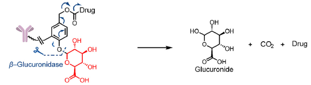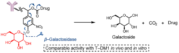 β-葡萄糖醛酸酶和β-半乳糖苷酶裂解的linker。此设计的linker中引入能被这两个酶特异性水解的基团+自降解spacer的组合,linker在β-葡萄糖醛酸和β-半乳糖基团被水解后经过自降解反应释放毒素(图5)。