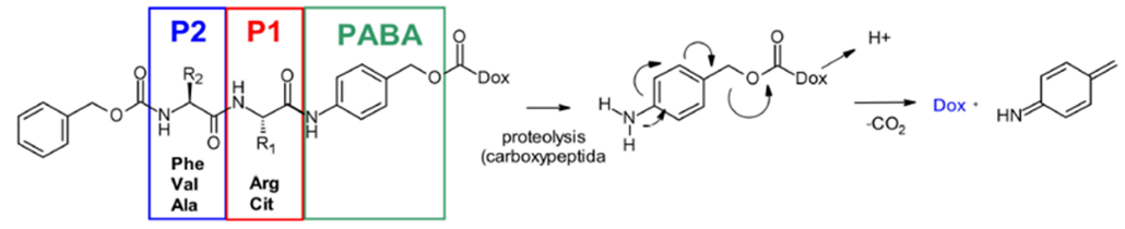 可以被组织蛋白酶裂解的linker。常见的是二肽(图2)或者四肽连接子(图3),这些肽段可以被多种组织蛋白酶裂解,然后裂解下来的部分发生自消除反应释放毒素。