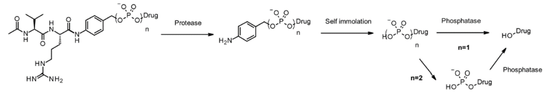 磷酸酶和焦磷酸酶裂解的linker。和组织蛋白酶一样,磷酸酶和焦磷酸酶也是一类在溶酶体中选择性表达的水解酶,针对这个特点就可以在linker的设计中加入磷酸基团或者焦磷酸基团,然后水解释放毒素(图4)。