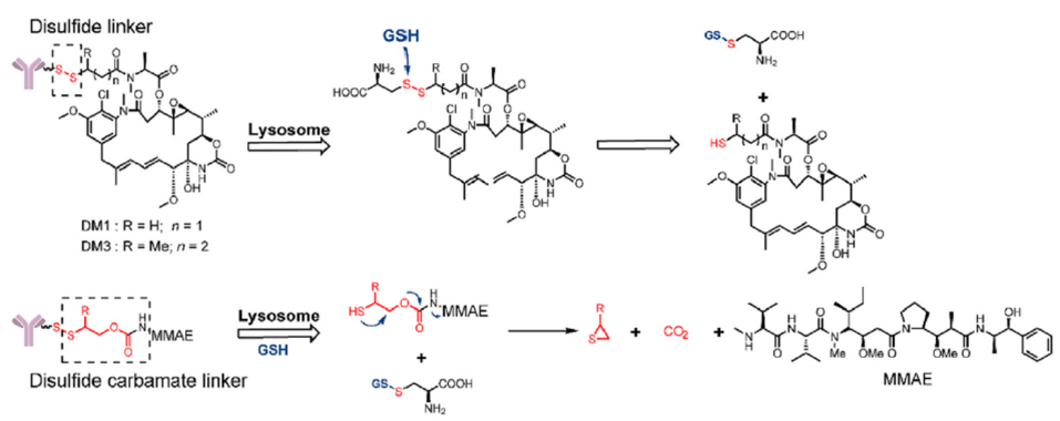 谷胱甘肽裂解的linker,也就是带有二硫键基团的linker。大部分肿瘤细胞中谷胱甘肽的含量都高于正常细胞,因其具有一定的还原性,可以还原二硫键从而释放毒素(图7)。