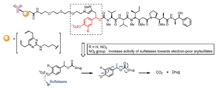 磺酸酯酶裂解的linker。和β-葡萄糖醛酸酶和β-半乳糖苷酶的设计思路一样,在linker中引入磺酸酯基团+自降解spacer的组合,linker被磺酸酯酶水解后经过自降解反应释放毒素(图6)。