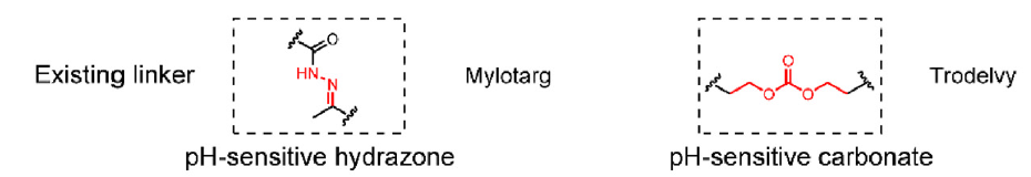 酸性条件下可以裂解的linker。相比正常体液和血液中中性偏碱的pH条件,肿瘤微环境的pH一般偏酸性,甚至可以低至6以下,这就可以设计对酸性条件敏感的linker基团,比如腙键和碳酸酯键等在中性条件稳定但酸性条件可以被裂解的基团(图8)。
