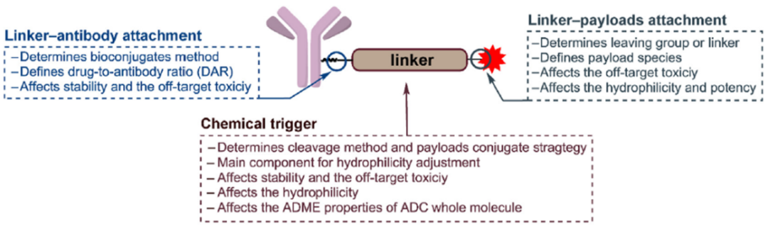 图1 触发linker断裂的化学基团、linker和抗体的连接位点以及linker和毒素的连接位点的作用[1]