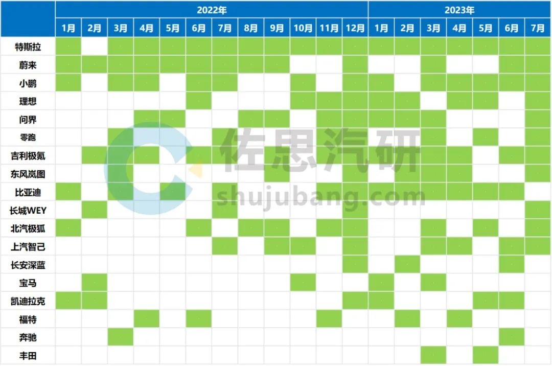 2022年1月-2023年7月主要汽车品牌OTA升级频率