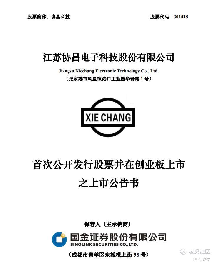 $协昌科技(301418)$ 【协昌科技将于8月21日在创业板上市】8月18日,深交所发布关于江苏协昌电子科技股份有限公司股票上市交易的公告。协昌科技股份有限公司将于2023年8月21日在深交所创业板上市。该公司人民币普通股股份总数为7333.3334万股,其中1738.6231万股股票自上市之日起开始上市交易。(公司公告)