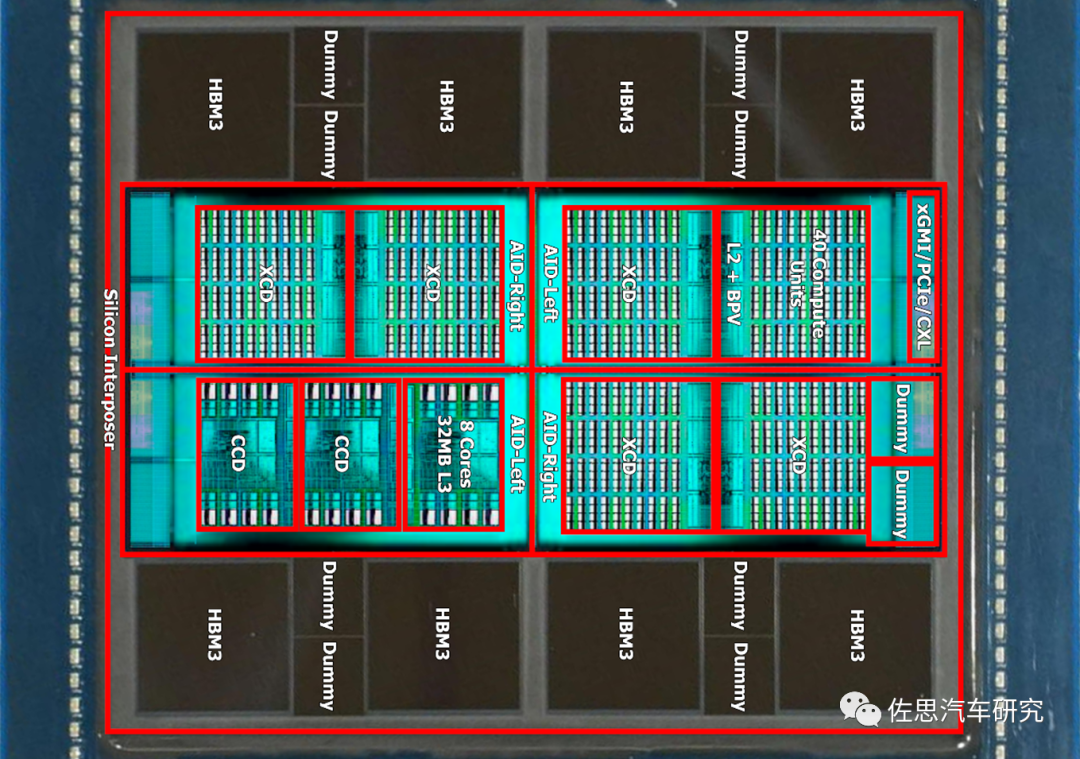 AMD MI300的die shot,不仅有6个HBM,还有GPU(即XCD),CPU(即CCD),I/O和AID。