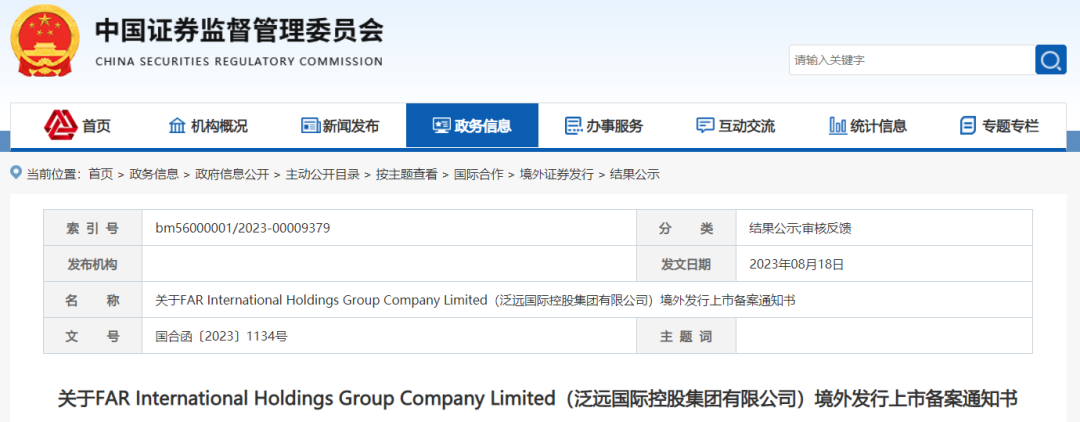 8月18日,中国证监会国际合作部发布关于FAR International Holdings Group Company Limited(泛远国际控股集团有限公司)境外发行上市备案通知书(国合函〔2023〕1134号)。根据中国证监会发布的境外上市备案情况表,泛远国际的申报类型为间接境外上市,备案申报主体为杭州泛远国际物流有限公司,备案接收日期为2023年6月29日。中毅资本为其独家保荐人,锦天城为其境内律师。