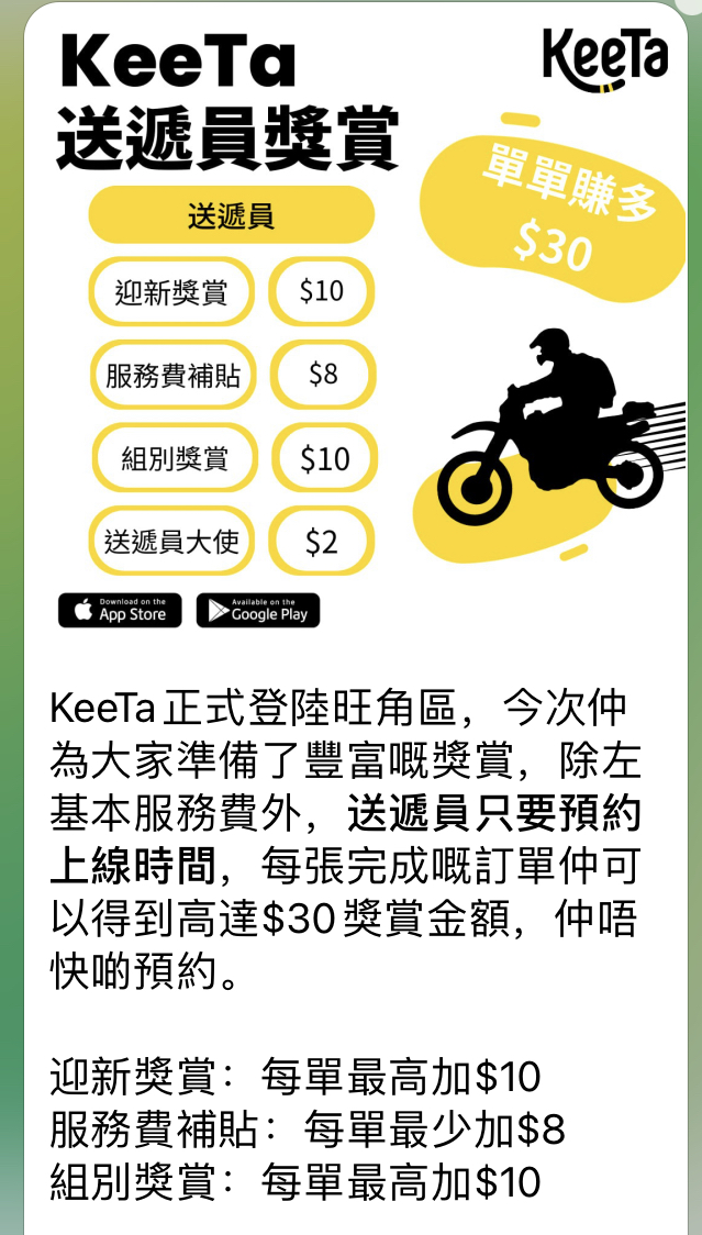 为扭转香港外卖行业这一点,在美团进军香港后,港版美团KeeTa推出“十亿激赏”的优惠,吸引新用户下单和运费减免等优惠。在配送运力上,美团向骑手提供的薪资也高于另外两家外卖平台。