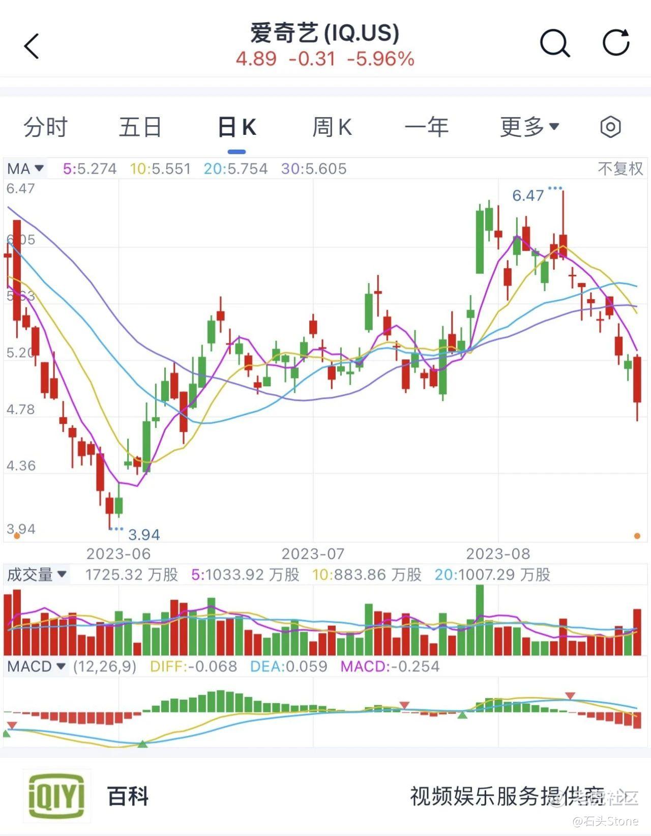 其次就是股价,爱奇艺股价在2023年8月22日公布财报后,直线跳水,从每股$5.23的价格直接跌破5美元,此前的短期高点为6.47美元,低于我在第一季度给出的高点8美元位置。