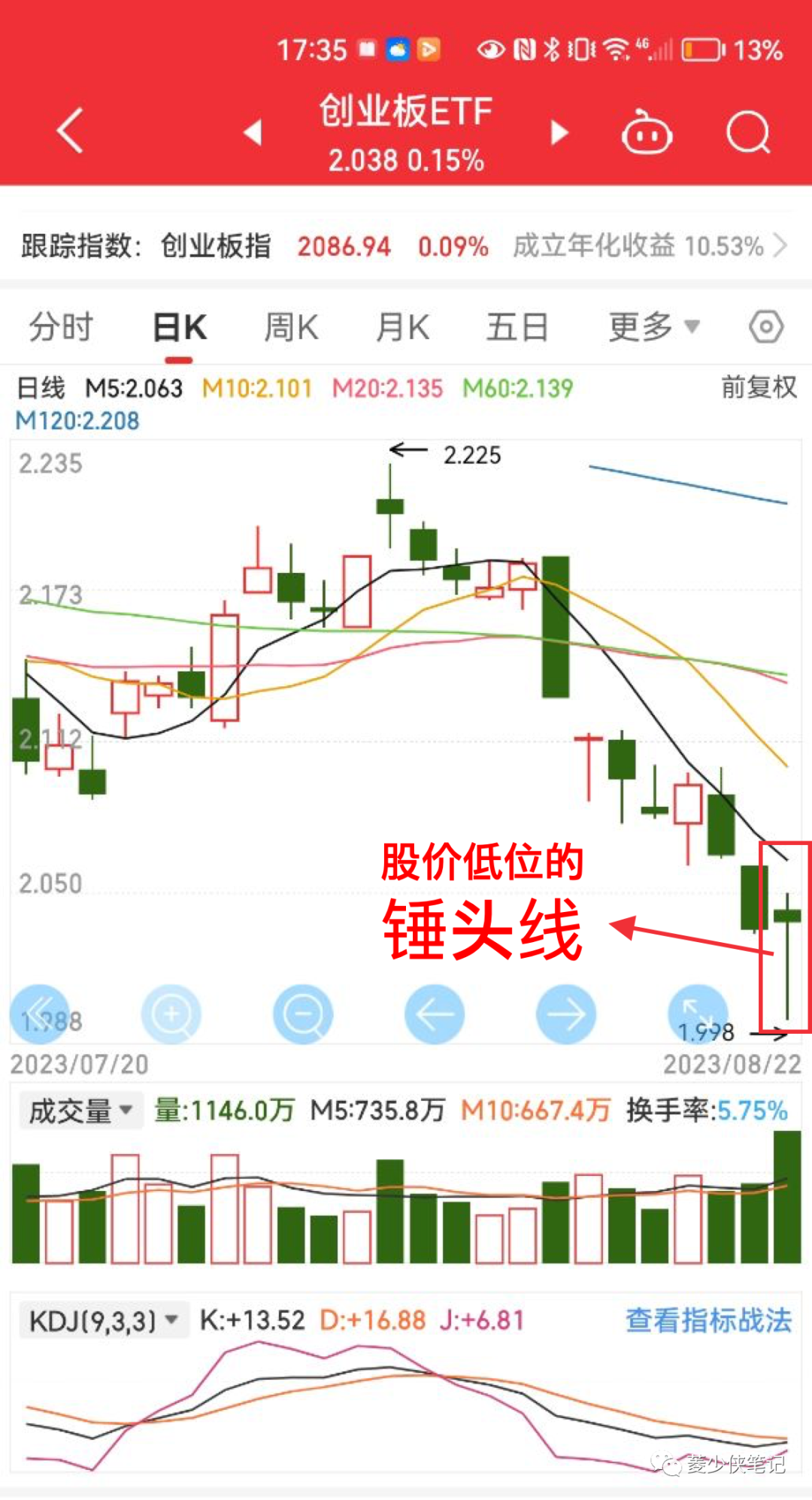 昨天(2023年8月22日),创业板(159915)收盘后呈现的K线图,是一个“下影线远长于实体部分”的锤头线!