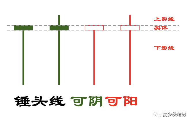 K线实体比较短,但是有长长的下影线,通常下影线是实体的3倍以上