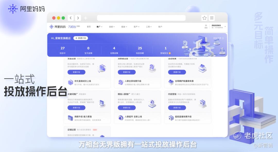 洞察到这一趋势,阿里妈妈近期推出了新的一站式营销投放系统——万相台无界版,打破直通车、引力魔方、万相台等各渠道独立投放的流量壁垒,首次整合包含搜索、曝光、短视频、直播、线索、动态图文等淘内经营渠道,帮助商家更简单、更多元、更精准、更高效的进行电商经营,实现全店生意的高效增长。