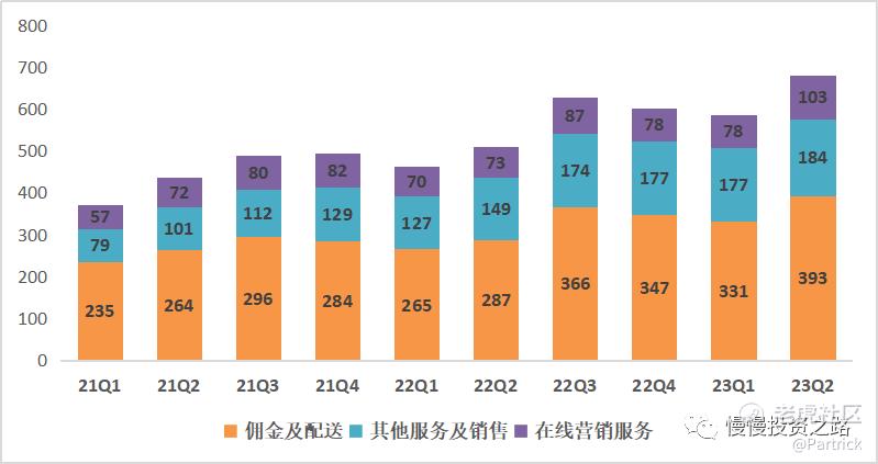 配送服务:Q2收入203.7亿元,同比增长27.7%,这部分主要是基本盘外卖部分,增速有所放缓。
