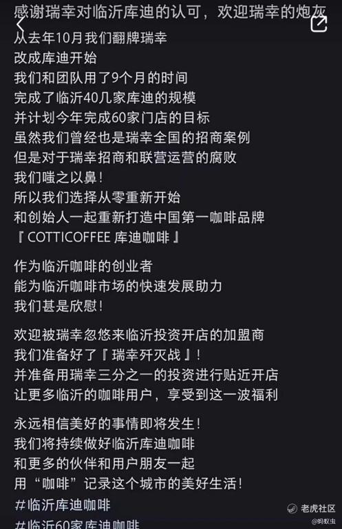 这位加盟商表示,他们用9个月的时间在临沂开了40几家门店,并准备用瑞幸三分之一的投资继续贴近开店。回应里的“瑞幸歼灭战”一词,算是彻底挑起了双方战火。