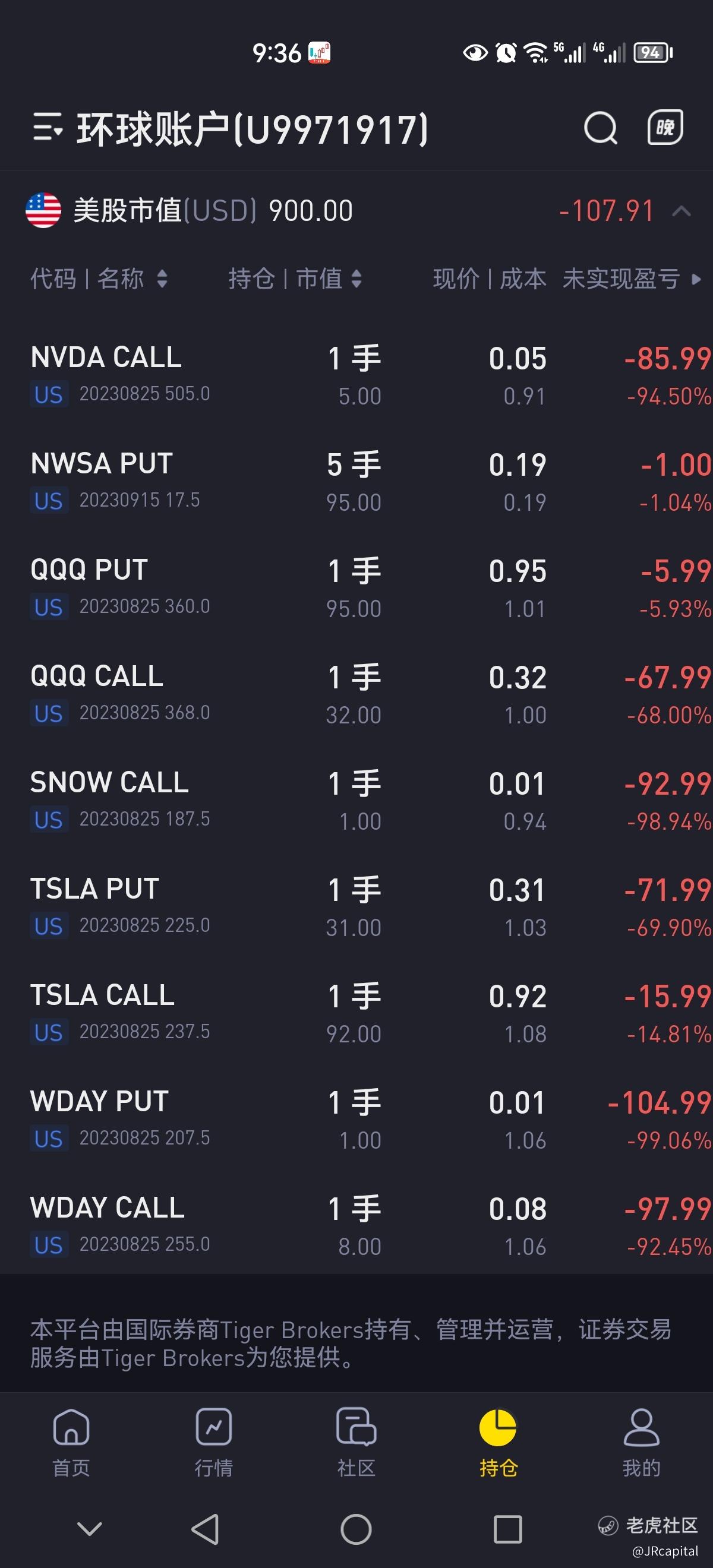 本周整体亏损300美金,最大亏损在NVDA的赌财报的复合宽跨式期权组合。财报前期权价格太昂贵,由于资金有限,没有合适的策略,本不应该参与的。还好在NVDA财报后构建的跨式期权盈利,本周基本回本。