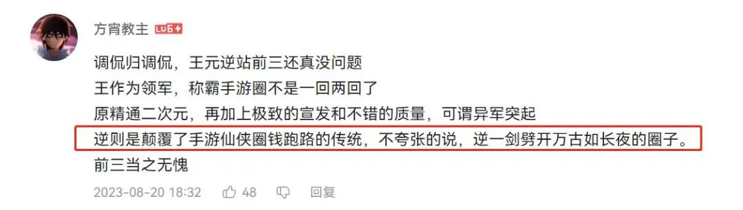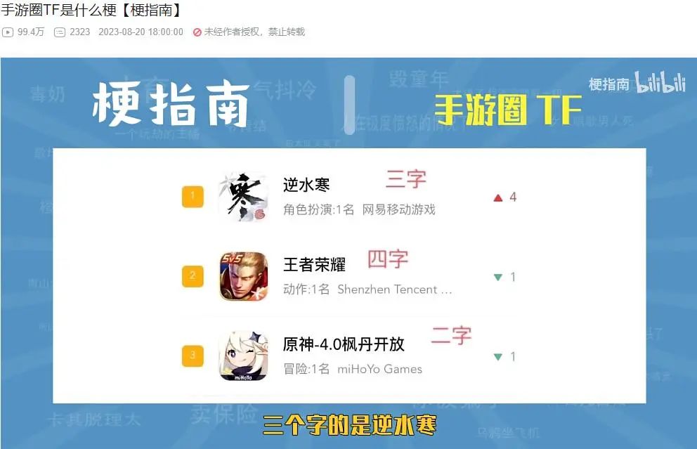 霸榜畅销榜多日的《逆水寒》手游,同另外两款头部产品《王者荣耀》《原神》恰好组成四字、三字和二字的排列,促使玩家联想玩梗。很快,三款高人气手游被戏称为:游戏圈TF GAMES。某种程度上,也是游戏得到大量玩家认可的直接表现。